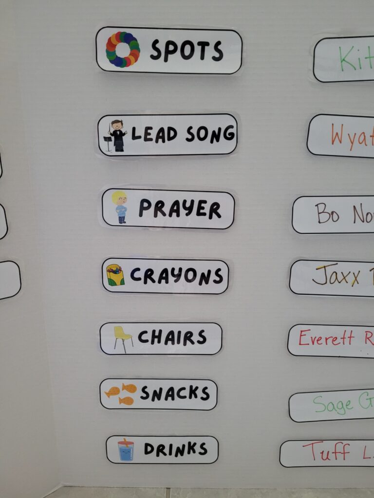 The tri-fold setup allowed us to clearly show who was helping with which responsibilities that day. It also made transitions smoother and reduced some of the power struggles that naturally pop up in nursery. Instead of saying, “Please don’t do that,” we could often redirect with, “Let’s check your job,” or “It’s time for your turn to help.”
