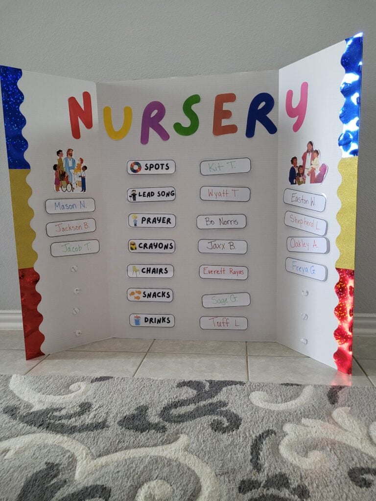 Because this worked so well for us, we decided to share it. Included are links to the Canva templates so you can easily print and customize your own tri-fold nursery display. Whether you’re serving in a large nursery or a small one, this setup can be adapted to fit your needs.