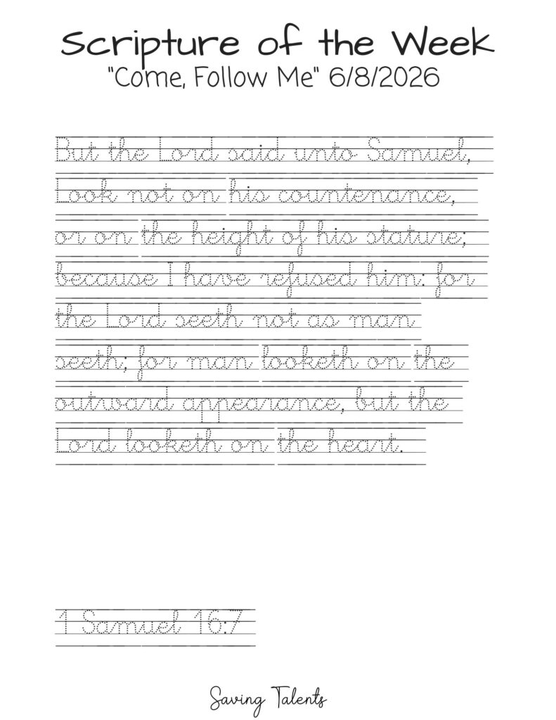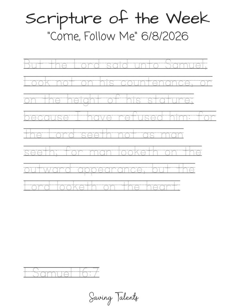 Work on memorizing this scripture with your children during the week for Come Follow Me 6/8: 1 Samuel 16:7