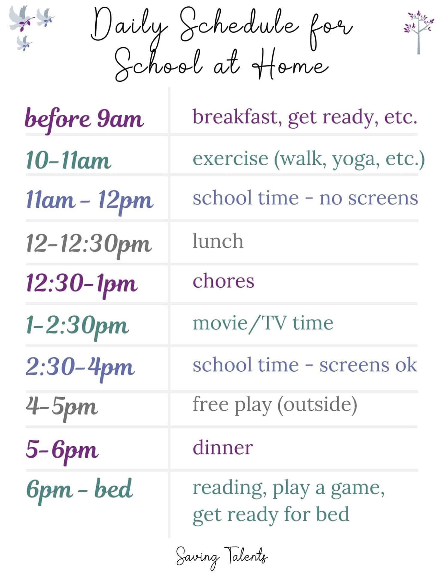 We get it, being cooped up at home is hard. Feel free to adjust the times based on how early/late your children wake up and go to bed.