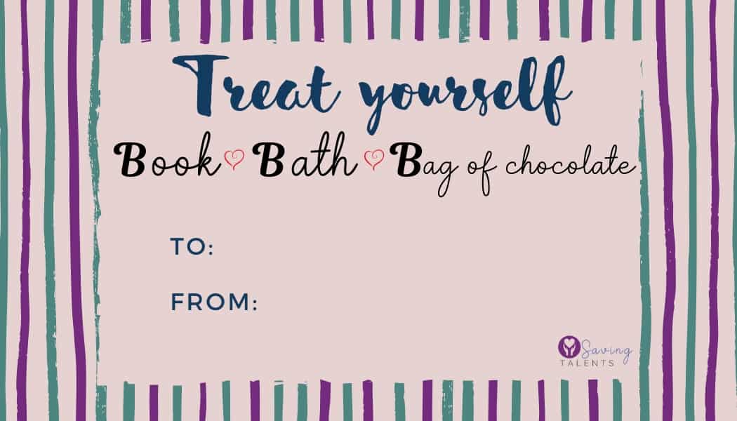 Out of all the gifts, though, this “Treat Yourself” free printable paper gift tag is one of our favorites! It’s easy to have on hand, and it’s a pretty universal gift (well, mostly for women, although some men may enjoy it). It’s a present that allows someone to pamper themselves with the three B’s: a book, a hot bath, and a box (or bag) of chocolates!